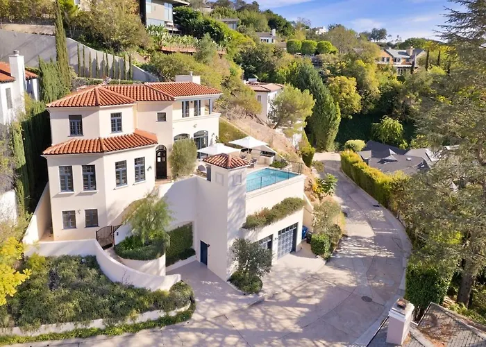 Offering a sauna for a relaxing experience, Chateau Beverly Hills By Stay Awhile Villas Los Angeles is located 6 km from the Petersen Automotive Museum. This 5-bedroom villa, situated 10 minutes' drive from the mansion owned by Johnny Depp|Johnny Depp's Mansion, invites guests to enjoy views of the garden from a terrace with a swimming pool.